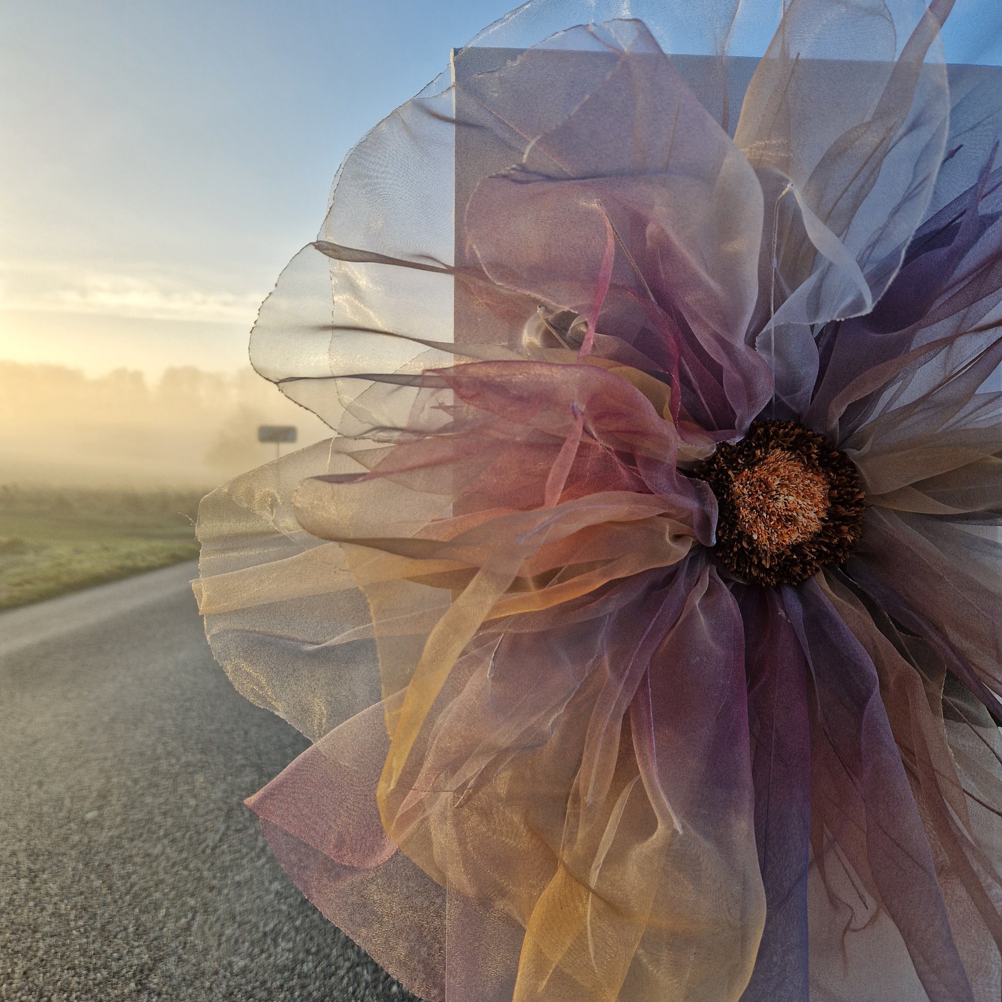Her er de cremede kronblade farvet med en dueblå, karry, gammelrosa og bordeaux spraymaling, som tilsammen har givet blomsten et eventyrligt udtryk.